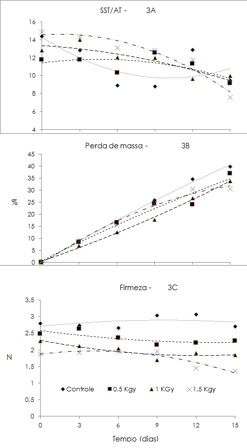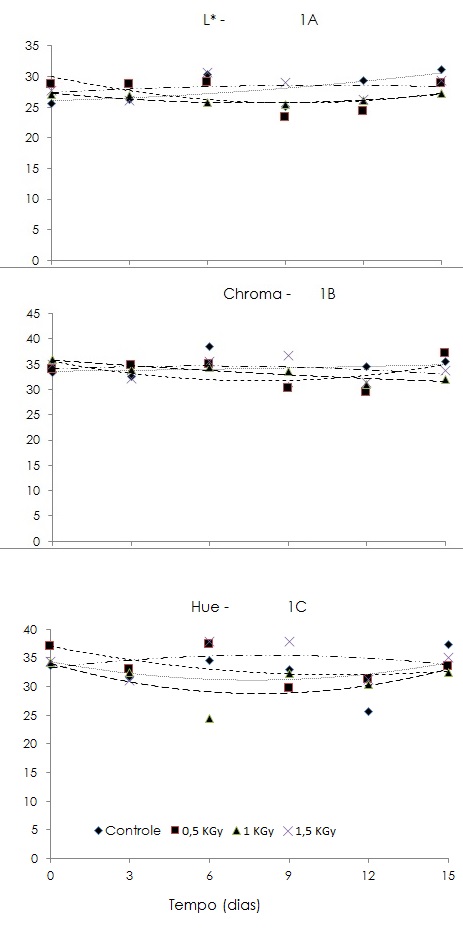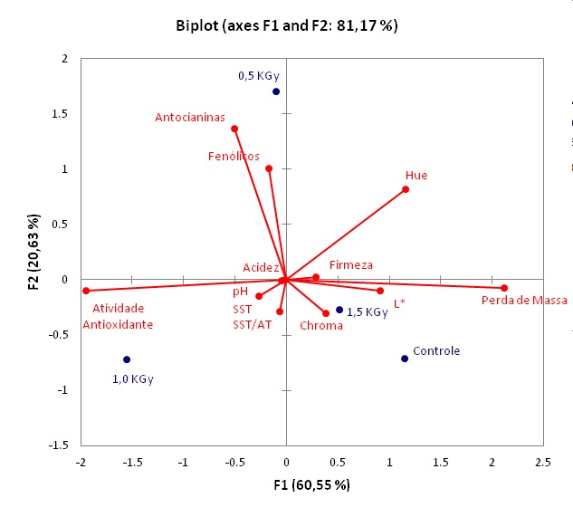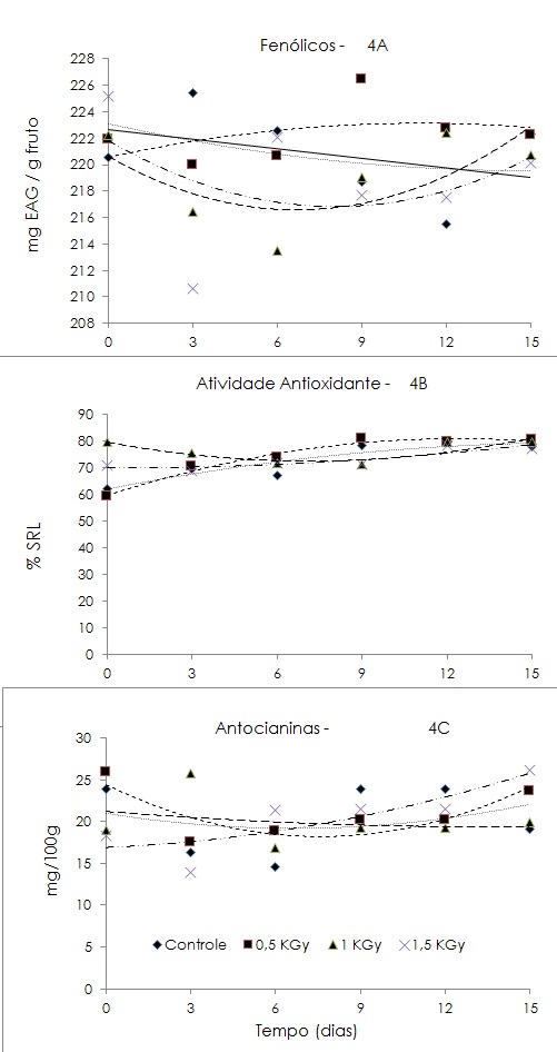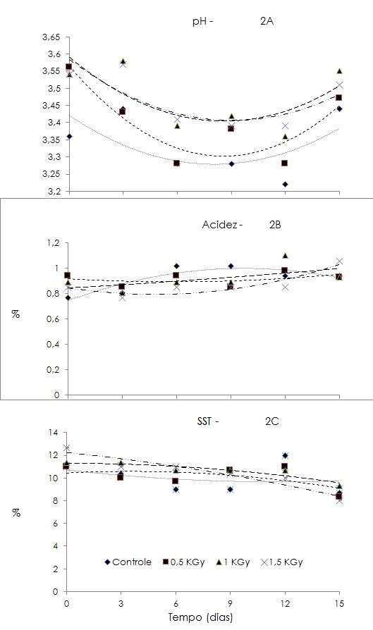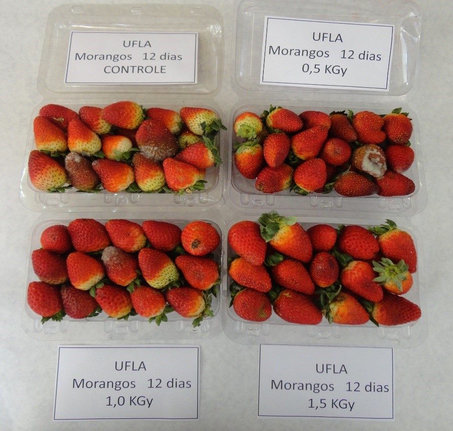 Strawberries attracts consumers due to its bright red color, characteristic odor, soft texture and slightly acid taste, with several phytochemicals groups that can bring health benefits. However, strawberries are very susceptive to decay, with a short shelf life and do not support sanitization. The cooling reduces the metabolism of fruits during postharvest period and the irradiation can be used as a complement to improve fruit preservation. The aim of this study was to evaluate the application different doses of gama irradiation (0,0 KGy; 0,5 KGy; 1,0 KGy e 1,5 KGy) aiming an extended shelf life and quality maintenance of strawberries stored at cold room (0 ± 1ºC and 90 ± 5% RH) during 15 days. Doses of gama irradiation were not sufficient to change quality parameters and nutritional compounds in strawberries during storage, and the microbiological levels were acceptable until the end of storage period regardless the treatment. Fruit treated with 1,5 KGy were characterized for the higher anthocyanins levels and maintained the lower visual decay index during the last days of storage when compared to other treatments.